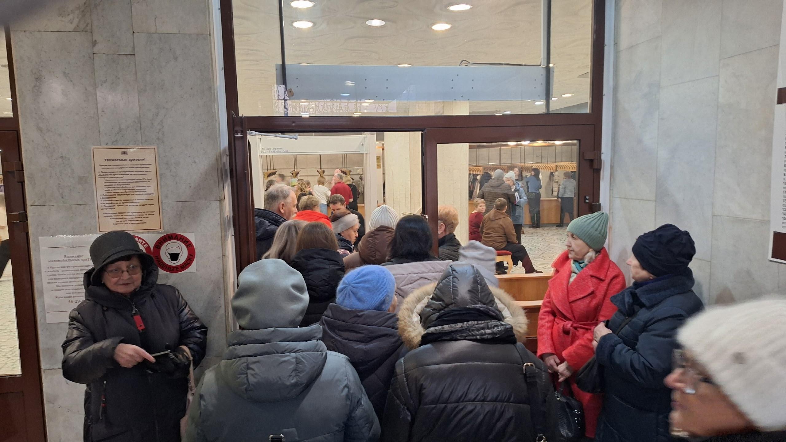 Очередь зрителей на входе в филармонию, предъявляющих билеты.