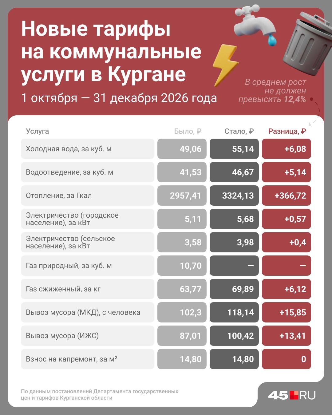 С 1 октября в Курганской области вступают в силу повышенные тарифы на жилищно-коммунальные услуги. В среднем рост составит 12,4%, что добавит к ежемесячным платежам несколько сотен рублей.