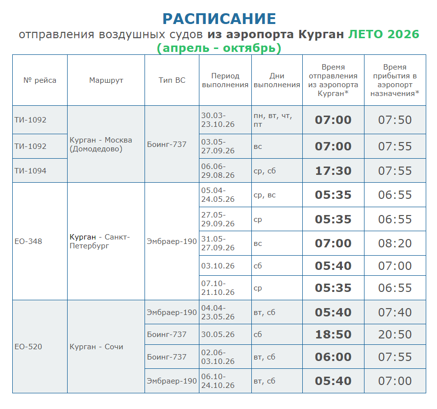 Расписание вылетов из аэропорта Курган на весенне-летний сезон 2026 года.