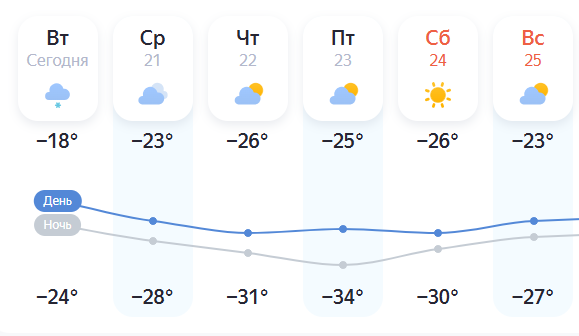 - Дневные показатели в течение недели составят от -23°C до -26°C.