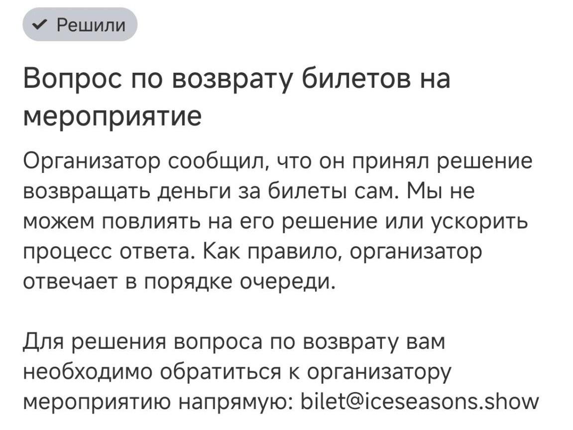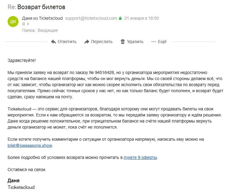 Ответ технической поддержки билетного сервиса о отсутствии средств у организатора.