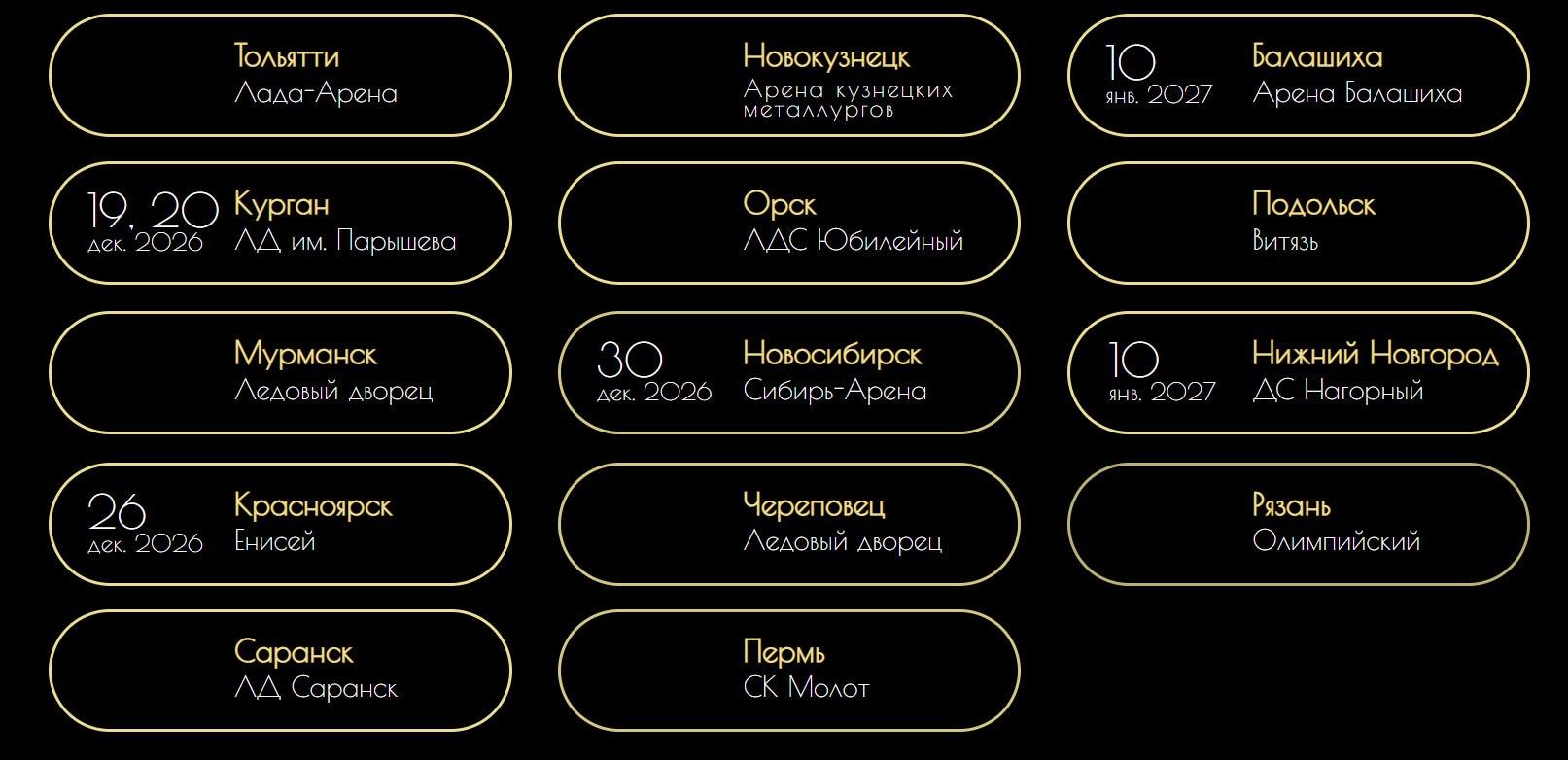 Представление «Щелкунчик на льду с симфоническим оркестром» должно было состояться в более чем 20 городах России. Согласно информации на сайте организатора, часть мероприятий перенесена на январь 2027 года.
