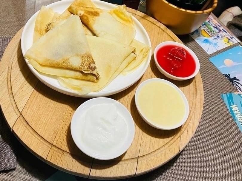 Семейное кафе «Традиции» предлагает простые блины с маслом за 60 рублей и со сметаной за 70. Более сытные варианты с курицей, лососем или красной икрой стоят от 160 до 490 рублей. На десерт можно взять блинный торт «Баунти» за 210 рублей.