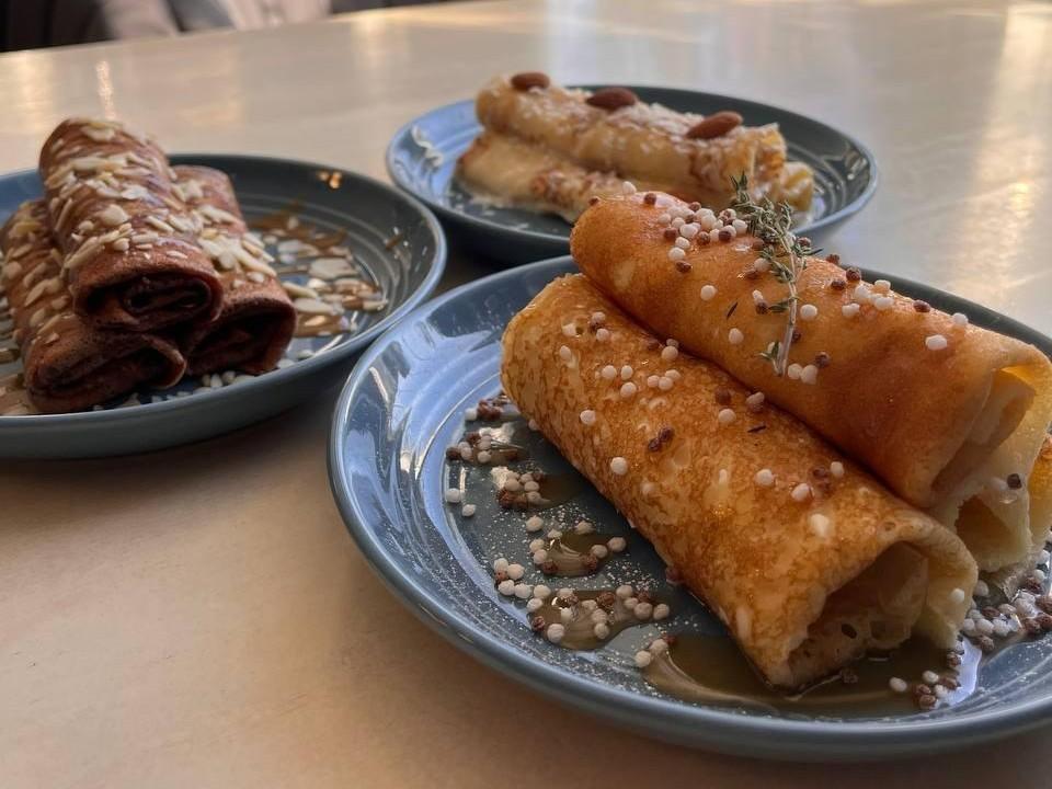 Кофейня «ZЁRNA» предлагает классические блины за 189 рублей и сытные с курицей, ветчиной или лососем (369–486 рублей). Среди десертных — блинчики «Рафаэлло», «Сникерс», «Банановый чизкейк» и французский «Крепп-сюзетт» по 380–420 рублей.