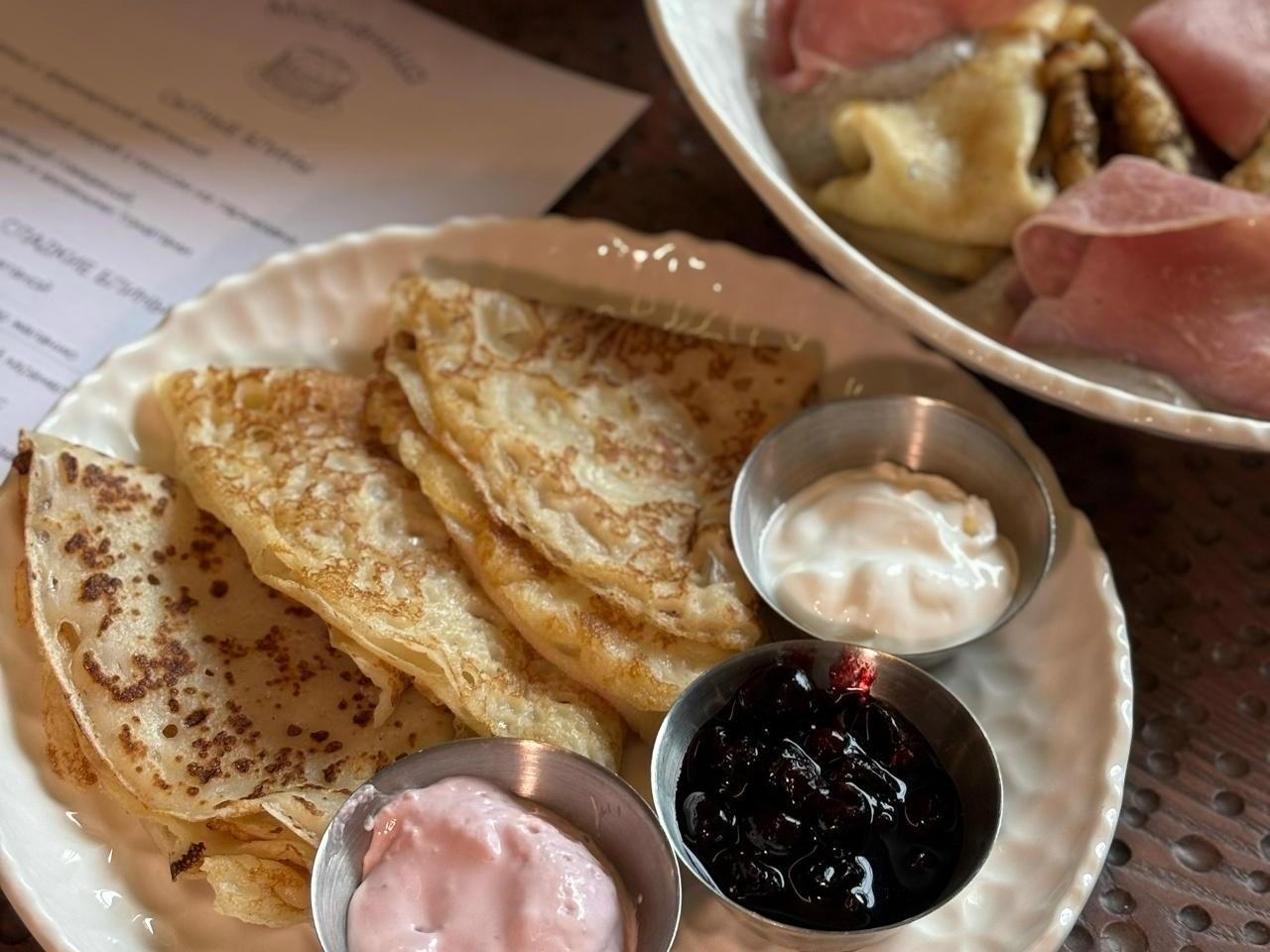 В семейном кафе «Mama mia» можно попробовать блины с телячьими щёчками или слабосолёным лососем за 580 рублей, а также с грибами и трюфельным маслом (450 рублей). Из десертных позиций — блины с тирамису или с кремом из рикотты и вишнёвым соусом по 390 рублей.