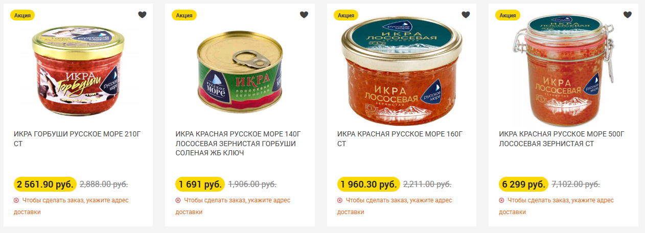 Натуральная красная икра здесь есть в двух вариантах: по 720 и 999 рублей без скидки за баночку 90 г. Чёрная икра представлена только пробойной икрой палтуса по цене 403 рубля за 100 г.