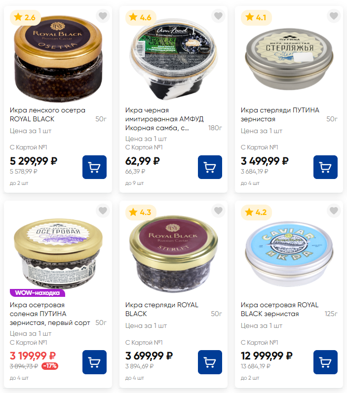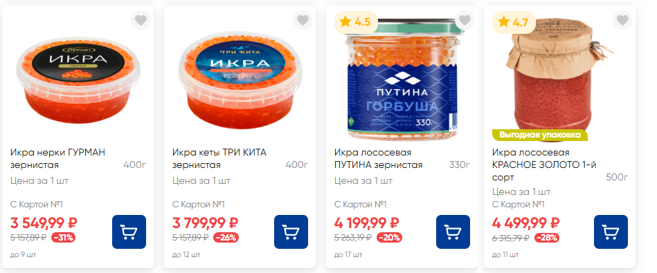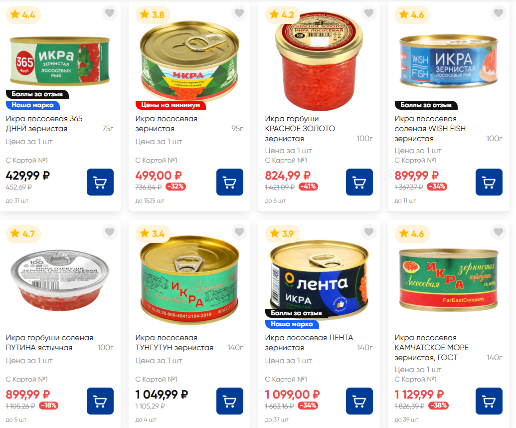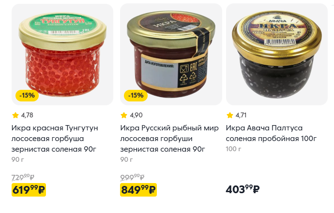 Самые дорогие варианты в «Ленте»: икра нерки — 3549 рублей за 400 г, икра кеты — 3799 рублей за 400 г, лососевая икра — 4499 рублей за 500 г.