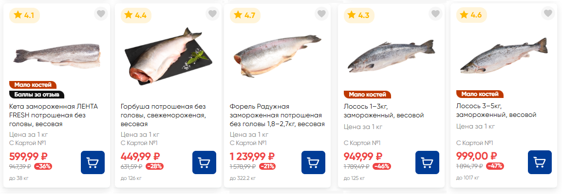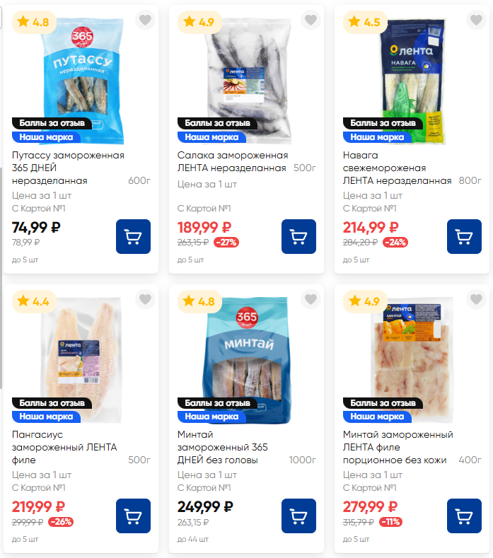 Ассортимент рыбы в «Ленте» традиционно больше, чем в других магазинах. Многие цены указаны со скидкой по карте магазина. Самой недорогой замороженной рыбой стала путассу — 74 рубля за упаковку 600 г. Салака стоит 189 рублей за 500 г. Филе пангасиуса весом 500 г обойдётся в 219 рублей, а килограмм минтая — в 249 рублей.