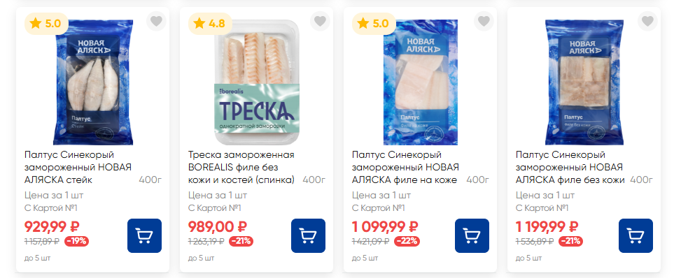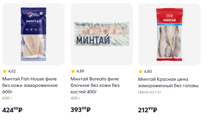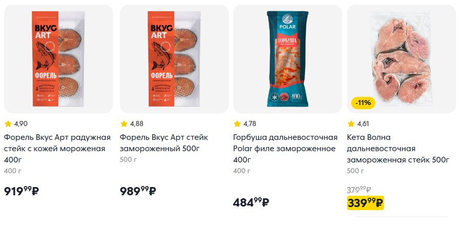 В каталоге «Пятерочки» также есть филе камбалы за 299 рублей (400 г), филе пангасиуса за 464 рубля (600 г) и филе тилапии за 369 рублей (350 г). Замороженная скумбрия продаётся по 393 рубля за килограмм.