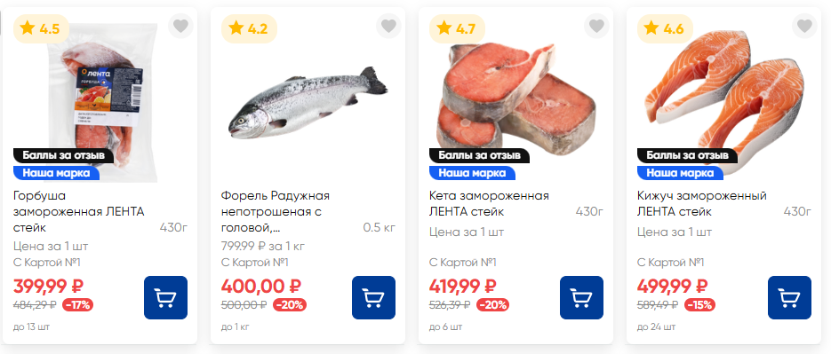 Самой доступной замороженной красной рыбой в «Ленте» являются стейки горбуши весом 430 г за 319 рублей. Также есть стейки кеты за 419 рублей и кижуча за 499 рублей за тот же вес. Небольшие радужные форели продаются по 400 рублей за 500 г.