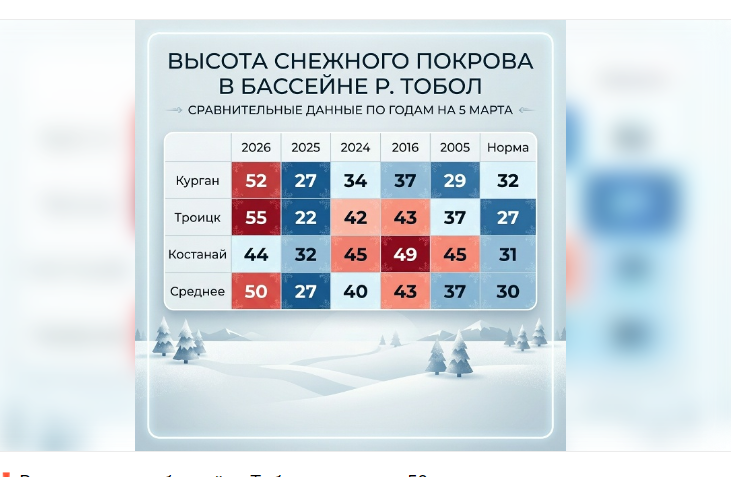 Винштейн напоминает, что весной 2024 года из Троицкого водохранилища в систему Тобола поступил рекордный объём воды, ставший ключевым фактором экстремального половодья. Текущая ситуация вызывает ещё больше опасений: «В настоящее время средняя высота снежного покрова по бассейну уже превышает значения 2024, 2016 и 2005 годов, что является крайне тревожным сигналом. В ближайшие 10–15 суток в ключевых районах бассейна ожидается ещё 12–15 мм осадков, поэтому снегонакопление продолжится».