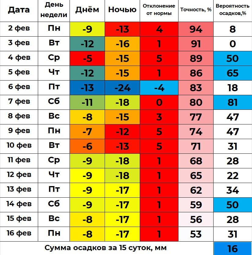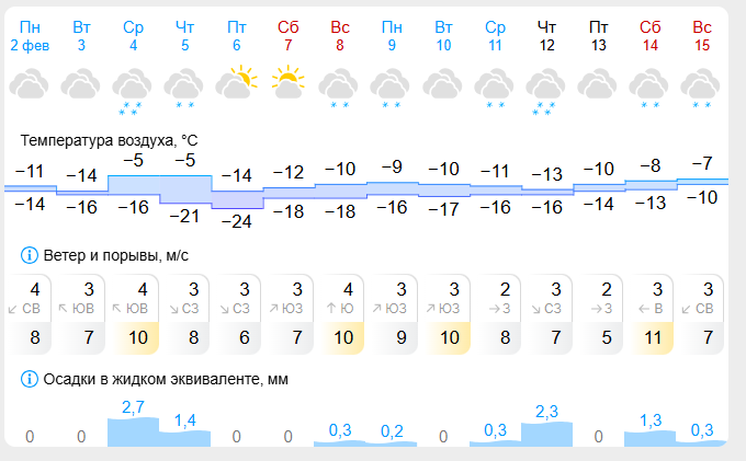 Самый тёплый день наступит в среду, а минимальная температура ожидается в ночь на 6 февраля, когда столбик термометра может опуститься до -24°C. Осадки в виде снега прогнозируются в следующие дни:
