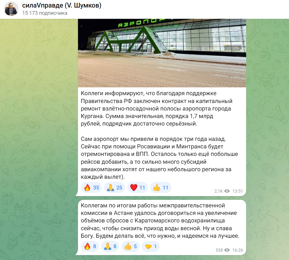 О достигнутой договорённости сообщил губернатор Курганской области Вадим Шумков в своём телеграм-канале. Он написал: «Коллегам по итогам работы межправительственной комиссии в Астане удалось договориться на увеличение объёмов сбросов с Каратомарского водохранилища сейчас, чтобы снизить приход воды весной. Ну и слава Богу. Будем делать всё, что нужно, и надеемся на лучшее».
