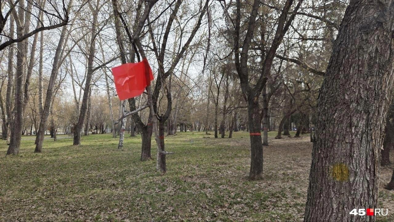 Красные ленточки на деревьях в ЦПКиО Кургана обозначают территорию будущего парка альпак