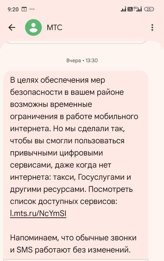 В тексте от компании МТС говорится: «В целях обеспечения мер безопасности в вашем районе возможны временные ограничения в работе мобильного интернета. Но мы сделали так, чтобы вы смогли пользоваться привычными цифровыми сервисами, даже когда нет интернета: такси, Госуслугами и другими ресурсами». Оператор добавил, что звонки и отправка SMS-сообщений продолжают работать в штатном режиме, и приложил ссылку на перечень доступных онлайн-ресурсов.