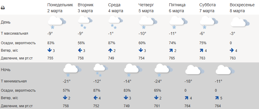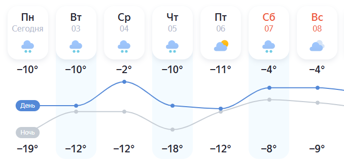 Сервис «Яндекс Погода» сообщает о сходных условиях. Дневные температуры составят от -10° до -2°, причем в среду ожидается кратковременное потепление до -2°. Самые холодные ночи — сегодня и в четверг, с понижением до -19° и -18° соответственно. Снег возможен с понедельника по четверг, а также в субботу.