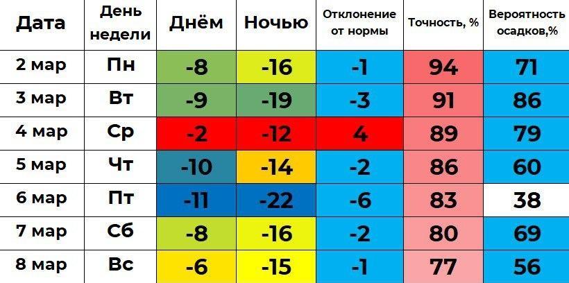 - Четверг и пятница: днем -10° и -11°, ночью в четверг до -24°;
