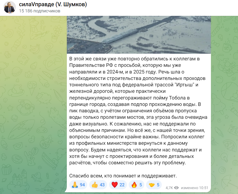 Предложение губернатора Курганской области Вадима Шумкова от 13 февраля о строительстве гидротехнических тоннелей под федеральной трассой «Иртыш» для пропуска реки Тобола в половодье активно обсуждается жителями.