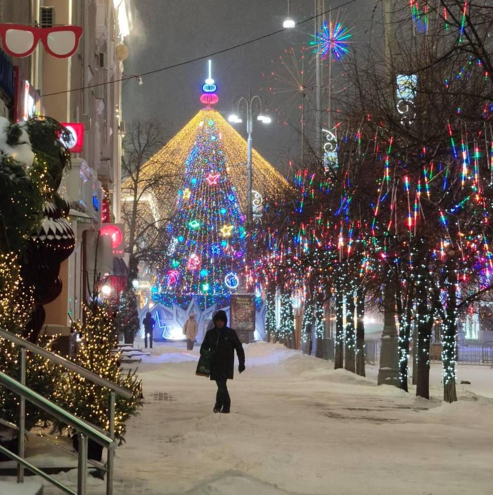 На снимках видна главная ёлка в светодиодном шатре, праздничные ворота, фигуры жар-птицы и оленя. У постамента Ленина установили светящиеся цифры «2026».