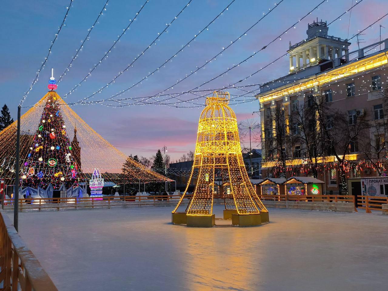 Возле ёлки на площади залили каток, в центре которого по традиции разместили большой светящийся колокольчик. Вход на каток бесплатный, коньки доступны для проката.