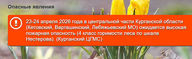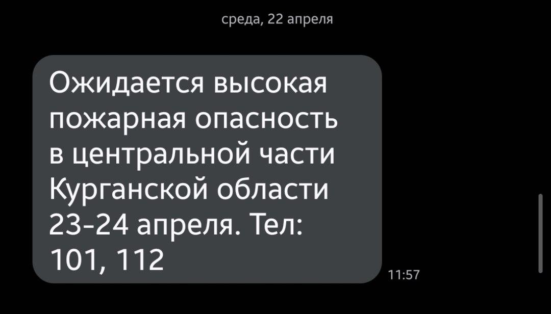 Сегодня жители Курганской области получили смс-сообщения от МЧС с предупреждением о высокой пожарной опасности в центральной части региона. Курганский центр по гидрометеорологии и мониторингу окружающей среды также выпустил штормовое предупреждение: 23 и 24 апреля в Кетовском, Варгашинском и Лебяжьевском округах ожидается четвёртый класс горимости леса по шкале Нестерова.