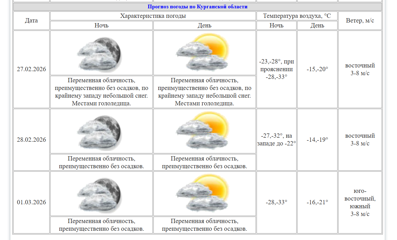 Курганский центр по гидрометеорологии и мониторингу окружающей среды передаёт, что в ночь на 28 февраля столбики термометров опустятся до -27...-32°C, на западе региона до -22°C. Днём 28 февраля температура достигнет -19°C. 1 марта ночью прогнозируется -28...-33°C, днём — -16...-21°C.