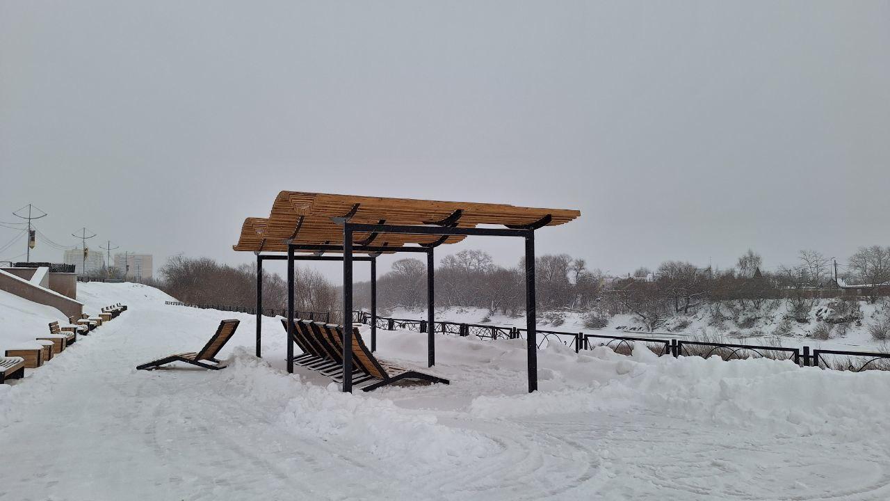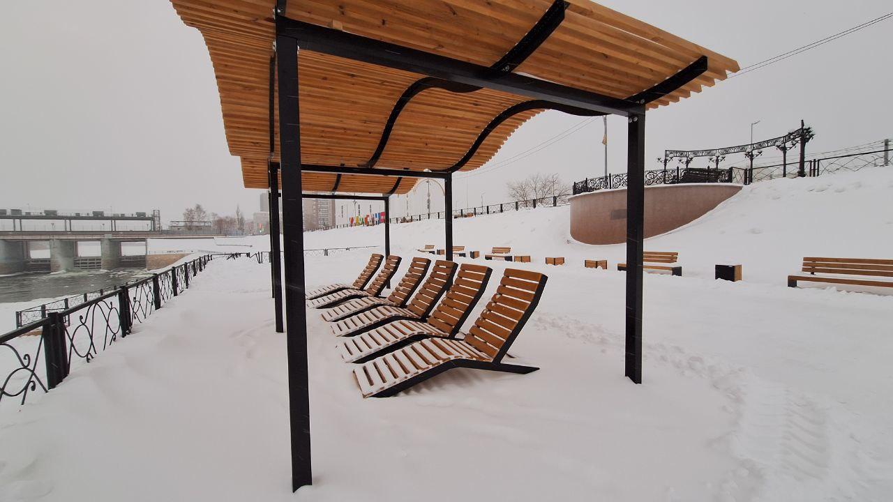 На курганской набережной появились шезлонги и перголы