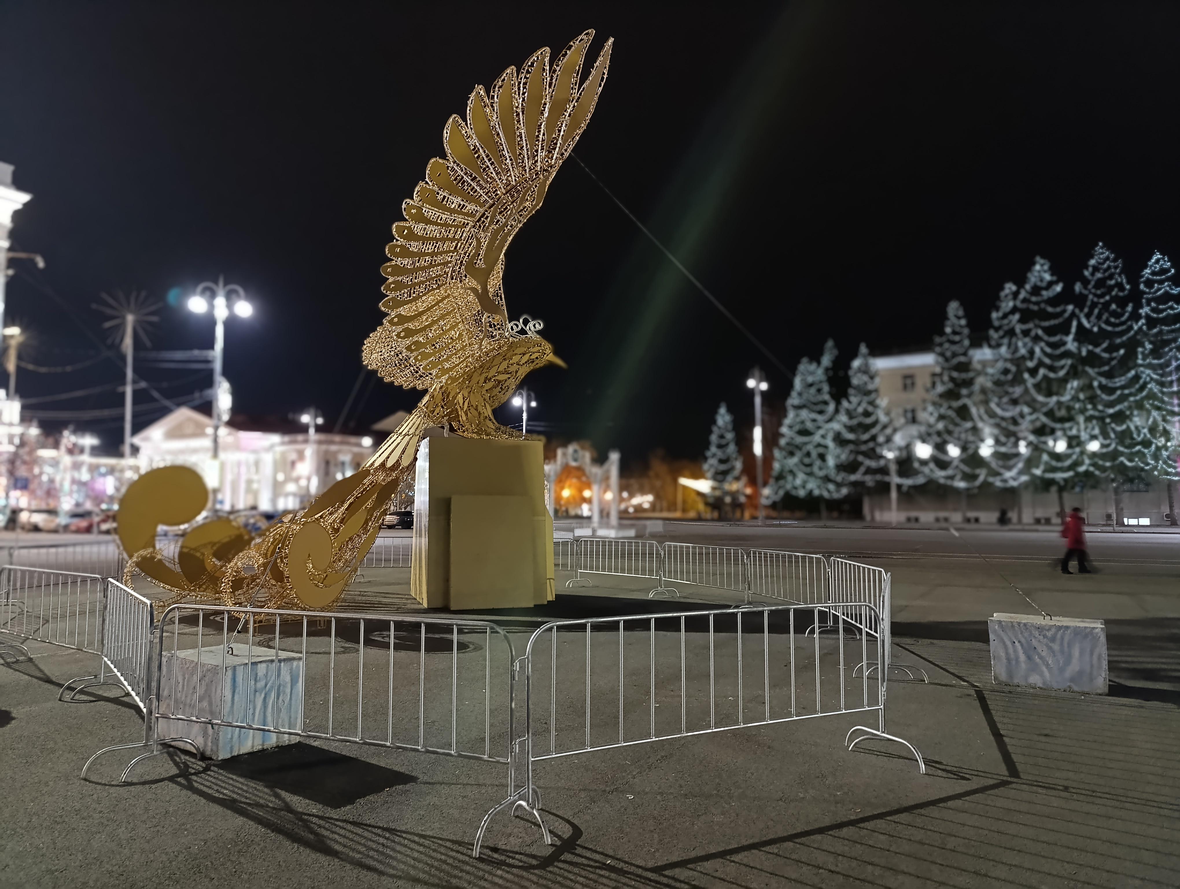 Рядом с памятником Ленину уже установили крупную световую инсталляцию в виде жар-птицы. Ее планируют включать в темное время суток.