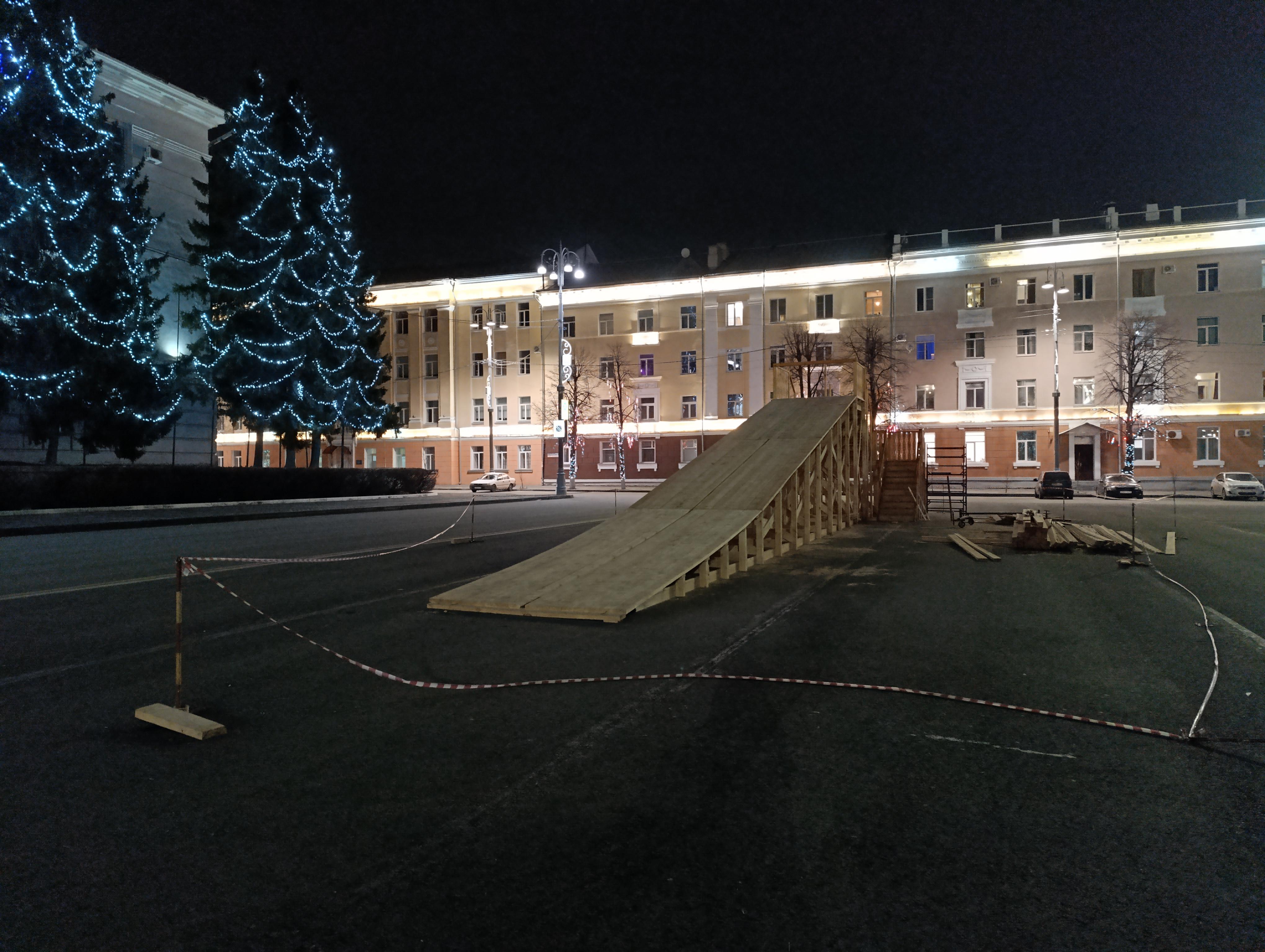 На центральной площади также смонтировали деревянную горку, однако работы по ее обустройству еще не завершены. И горка, и новогодняя ель в настоящее время огорожены сигнальными лентами.