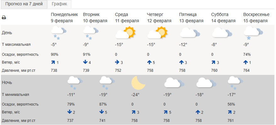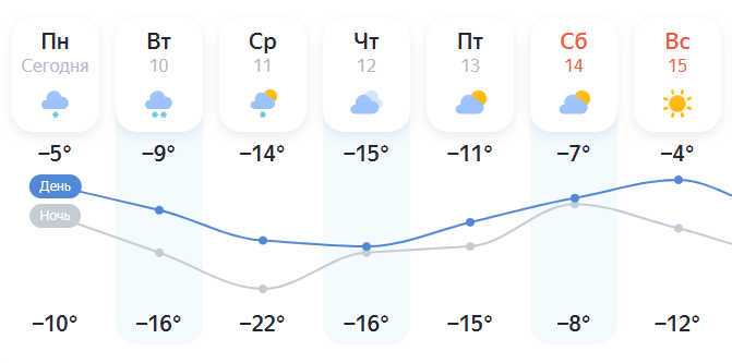 Илья Винштейн, автор проекта «Погода 45», прогнозирует снег в первые три дня недели, причём в среду вероятность осадков снижается до 53%. В понедельник он ожидает -6°. Самые низкие температуры, по его данным, придутся на середину недели: днём до -14°, ночью до -22°. К субботе потеплеет до -10° днём и -19° ночью, а в воскресенье днём будет -7°.