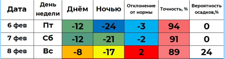 Автор проекта «Погода 45 — погода в Кургане» Илья Винштейн прогнозирует более низкие ночные температуры. В ночь на субботу может быть -24°, днём в субботу — -12 градусов. Ночью с субботы на воскресенье столбик термометра опустится до -21°, а днём в воскресенье поднимется до -8°. Вероятность осадков в воскресенье составляет 24%.