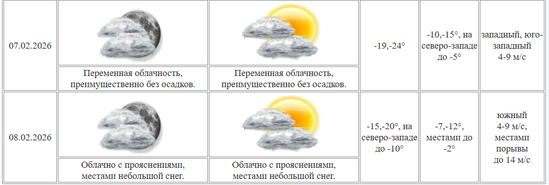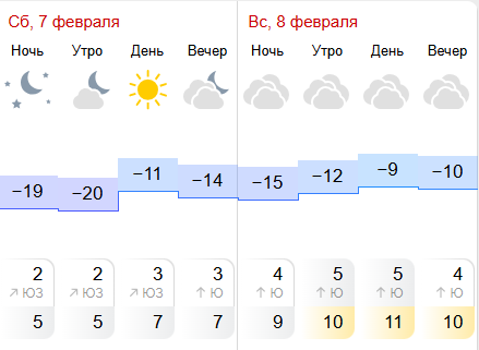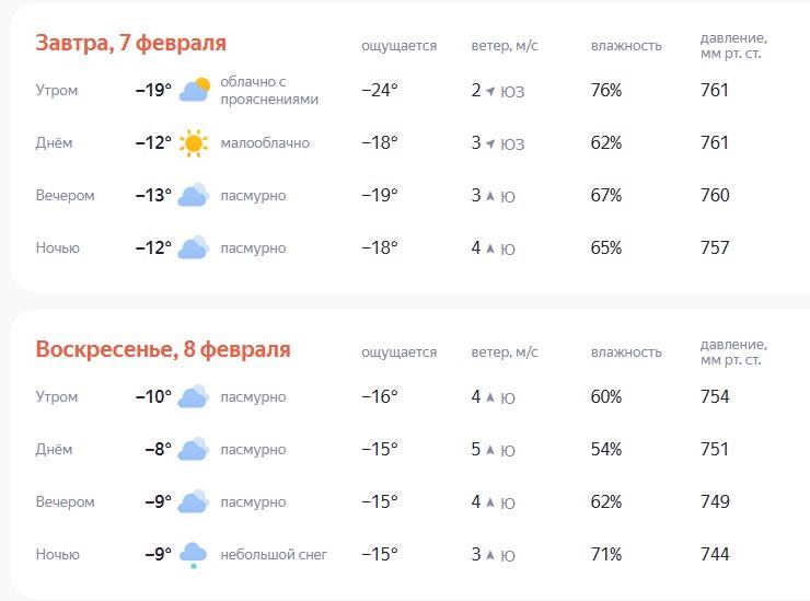 Прогноз от «Гисметео» обещает в субботу солнечную погоду с дневной температурой -11°. В воскресенье будет облачно, столбик термометра покажет до -9 градусов. Осадков не ожидается.