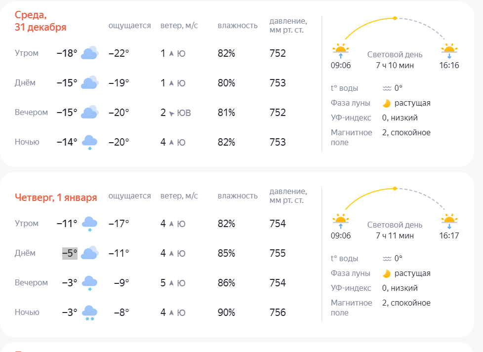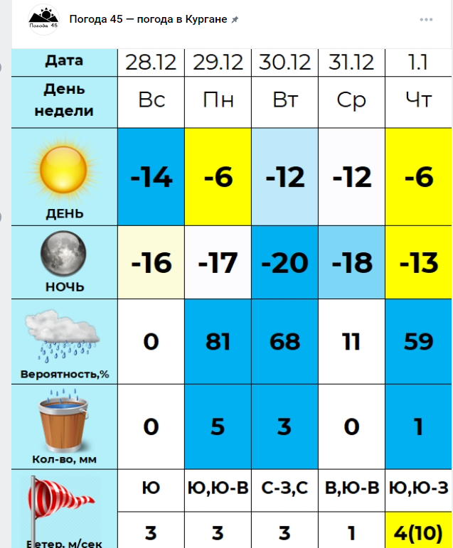Проект «Погода 45» указывает на 31 декабря дневную температуру -12°, а на 1 января -6°.