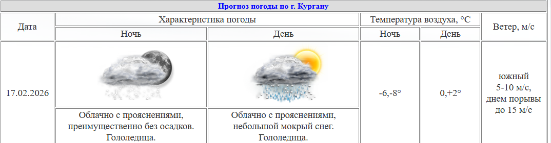 Курганские синоптики из ЦГМС прогнозируют на 17 февраля мокрый снег. В городе наблюдается временная оттепель, дневная температура воздуха достигнет значений от 0 до +2 градусов. Погода будет облачной с периодами прояснений, возможна гололедица.