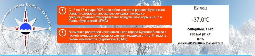 В 09:51 утра температура в Кургане упала до -37°C.