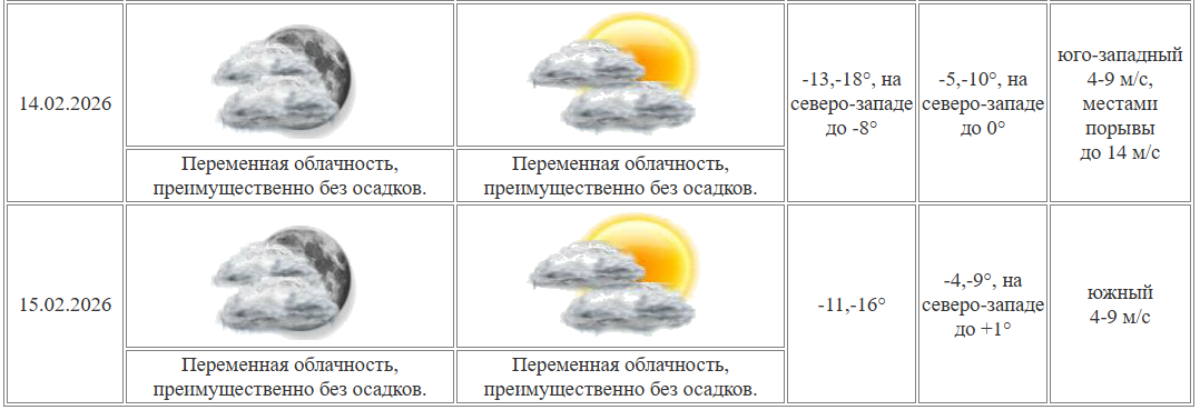 Синоптики курганского ЦГМС в прогнозе по области указывают на субботние дневные температуры в пределах -5...-10°. Ночью ожидается -13...-18°. В воскресенье, 15 февраля, днём потеплеет до -4...-9°. На оба дня обещана переменная облачность без осадков.