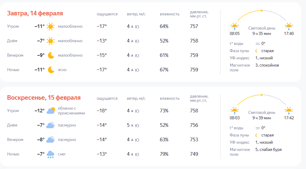 «Яндекс Погода» сообщает, что в День всех влюблённых будет -7° и малооблачно