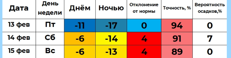 Сервис «Яндекс Погода» информирует, что в субботу днём температура составит около -7° при малооблачном небе. К вечеру похолодает до -9°, а ночью столбик термометра опустится до -11°. В воскресенье днём также прогнозируется -7°, но уже с пасмурной погодой, а к ночи возможен снег. Существенного понижения температуры не ожидается, поскольку в понедельник наступит потепление до 0°.