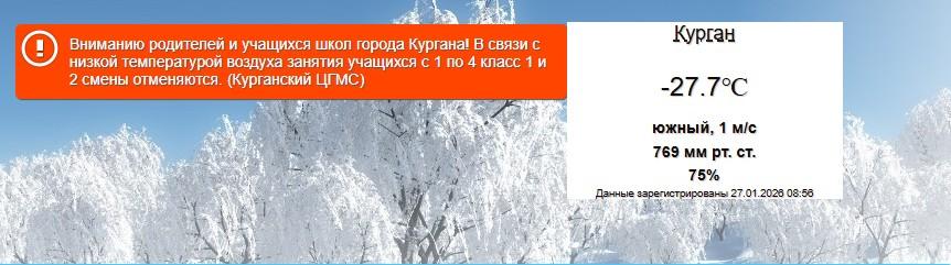 Утром 27 января температура в Кургане упала до -27,7°, поэтому ученики начальных классов второй смены учатся дистанционно.