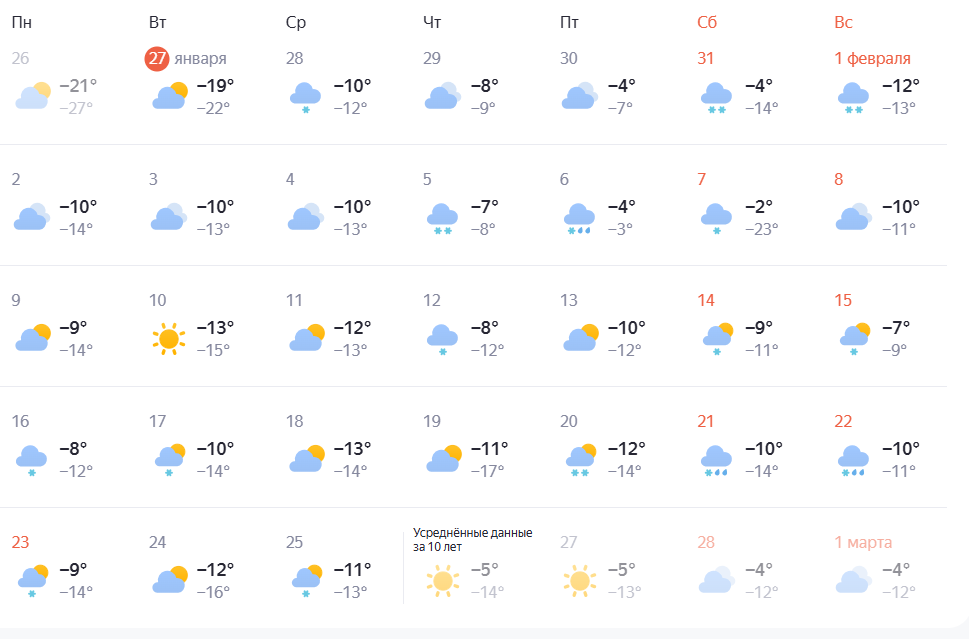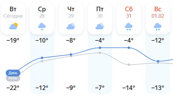 Ранее в тот же день были отменены уроки и для младшеклассников первой смены. Согласно прогнозу сервиса «Яндекс Погода», погодные условия начнут улучшаться: днем 27 января ожидается -19°, а в среду, 28 января, температура поднимется до -10° днем и -12° ночью. К пятнице и субботе воздух прогреется до -4° днем. В выходные прогнозируют снег, а в воскресенье столбик термометра вновь опустится до -12°.
