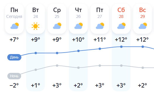 Согласно «Яндекс Погоде», ночные температуры в ближайшие дни не опустятся ниже нуля, составляя от +1 до +3 градусов. Днем ожидается потепление: во вторник до +9°, в четверг до +10°, а в пятницу до +11°. На выходных столбик термометра днем покажет +12°, ночью — +2...+3°.