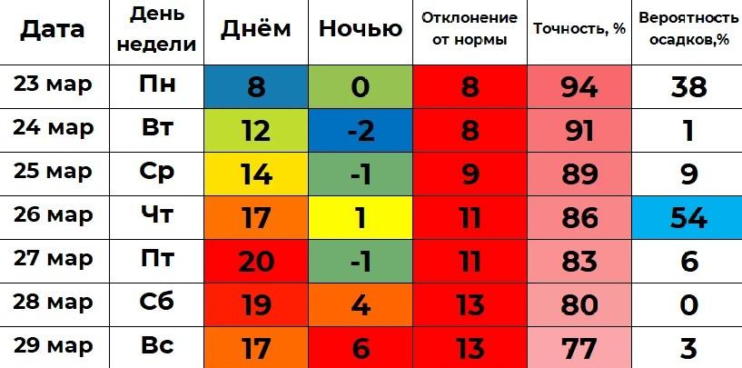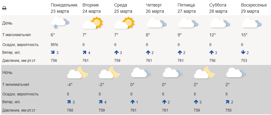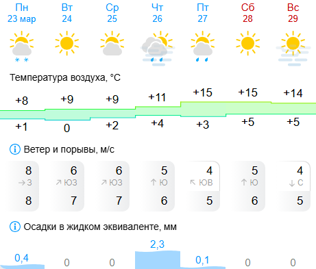 Прогноз «Гисметео» обещает с понедельника по среду +8...+9° днем и +1...+2° ночью. В четверг температура поднимется до +11°, возможны дожди. Пик тепла придется на пятницу и субботу с +15° днем и +3...+4° ночью. В воскресенье сохранится солнечная погода и около +14°.