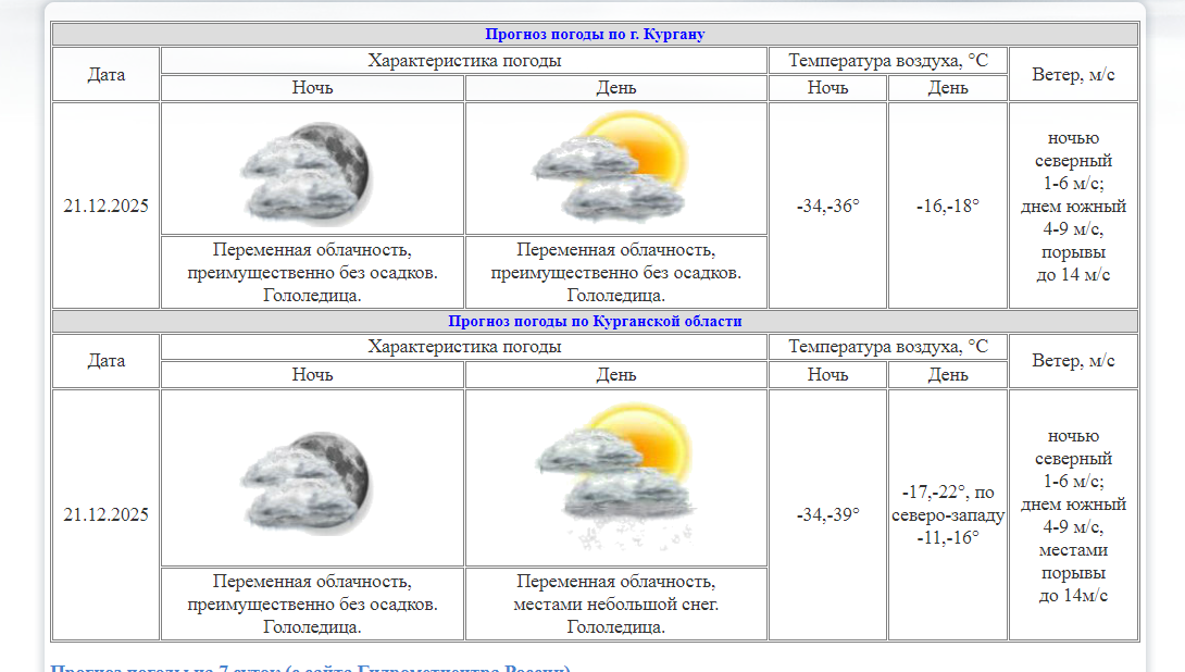 Курганский центр по гидрометеорологии и мониторингу окружающей среды предоставил данные: в девять часов утра в Кургане температура составляла -30.3°C. В течение дня ожидается потепление до -17...-22 градусов, а в северо-западных районах области — до -11...-16°. Ветер будет южным со скоростью 4-9 метров в секунду, с отдельными порывами до 14 м/с.