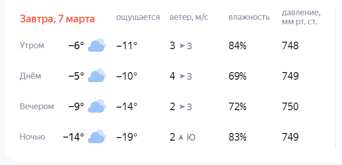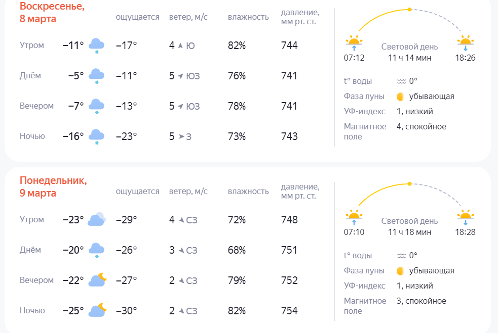 Согласно данным Яндекс.Погоды, в пятницу и субботу днем будет стабильно -5°C. В воскресенье утром прогнозируется -29°C, днем — -26°C, а ночью мороз усилится до -30°C.