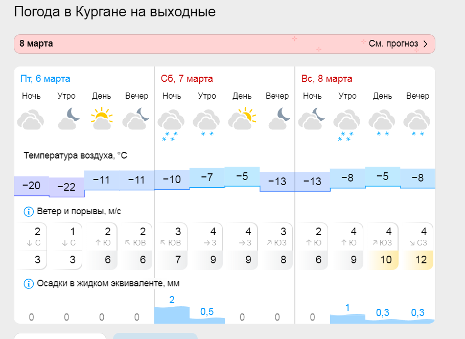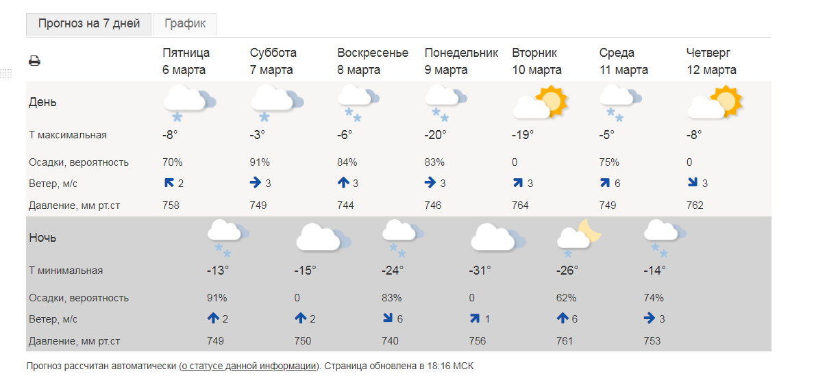 Гидрометцентр России сообщает о несколько более высоких температурах в пятницу и субботу: -3°C и -6°C соответственно. Однако в понедельник днем также ожидается -20°C.