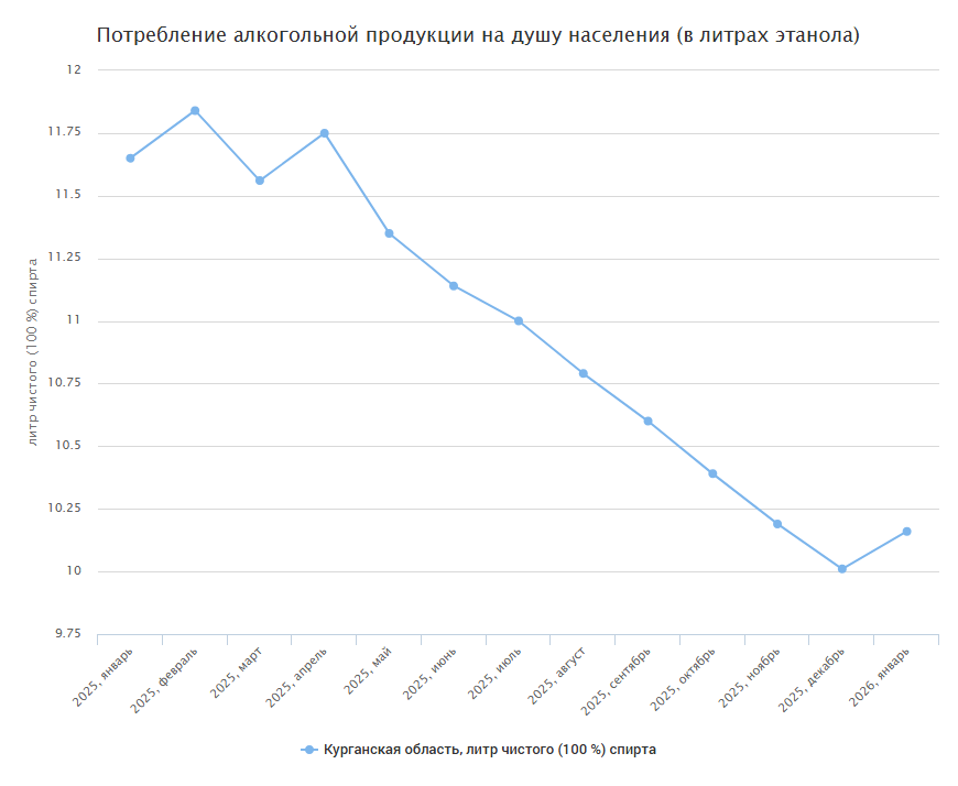 - Январь 2025 года — 11,65 литра этанола на человека;