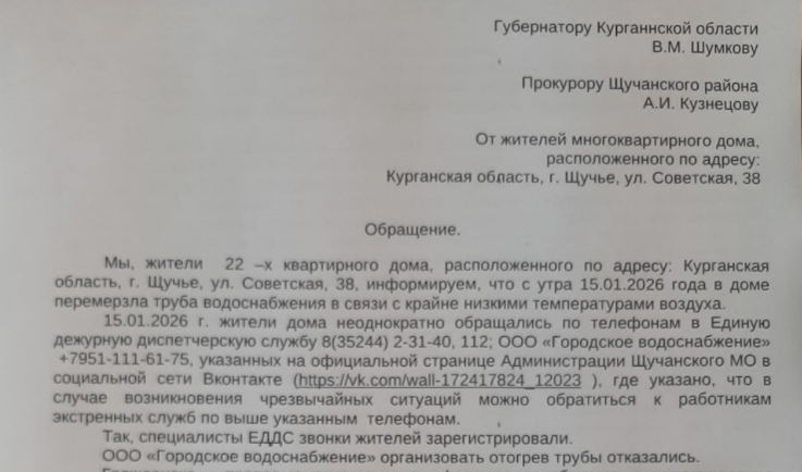 В администрации Щучанского округа жителям предложили решать вопрос с разморозкой трубы за свой счёт, что вызвало возмущение.