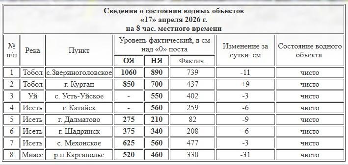 В Звериноголовском округе наблюдается противоположная динамика: за сутки уровень снизился на 11 сантиметров, составив 739 сантиметров утром. Однако паводок по-прежнему нарушает транспортное сообщение. Движение перекрыто с 16 апреля на 24-м километре автодороги «Подъезд к санаторию „Сосновая Роща“ — Бугровое — Редуть».