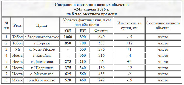 Данные об уровне воды в реках Курганской области на 24 апреля