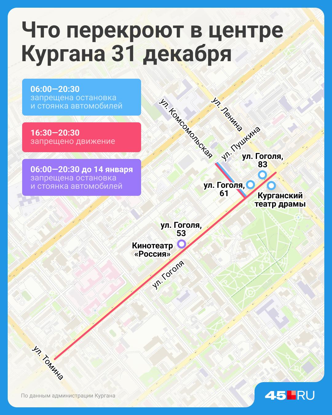 Дополнительно, до 14 января с 6:00 до 20:30 действует запрет на парковку у здания по адресу ул. Гоголя, 53, расположенного перед кинотеатром «Россия».